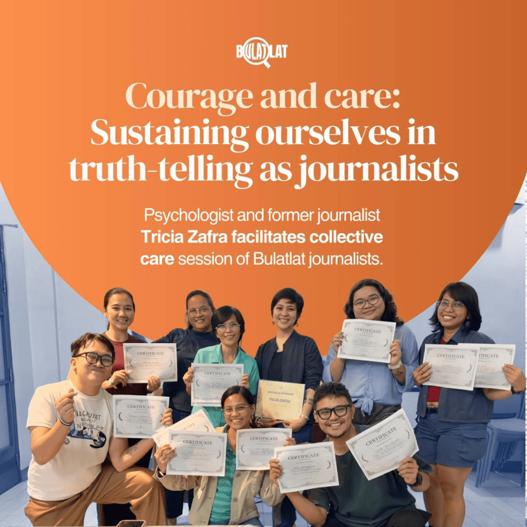 When Bulatlat’s Editor-in-Chief Len Olea reached out to collaborate on a mental health session for their staff, I was in awe. In the news industry that I knew, it’s rare for news managers to keep an eye on psychosocial well-being of the staff. And maybe that’s why earlier this year, during International Women’s Day in March, the Asian Center for Journalism at the Ateneo de Manila University, gathered female industry veterans and news managers for the National Conference of the Movement for the Safety and Welfare of Women Journalists (We-Move). One of the sessions was devoted to mental health. Olea attended this, and she has become more determined to ensure a newsroom where journalists feel safe and supported. In our alignment meeting before the session set for the Mental Health Month in October, Olea emphasized that their goal is to continuously strengthen their culture of collective care. This personally elicited in me a sense of hope. The professional culture I once knew is now shifting.